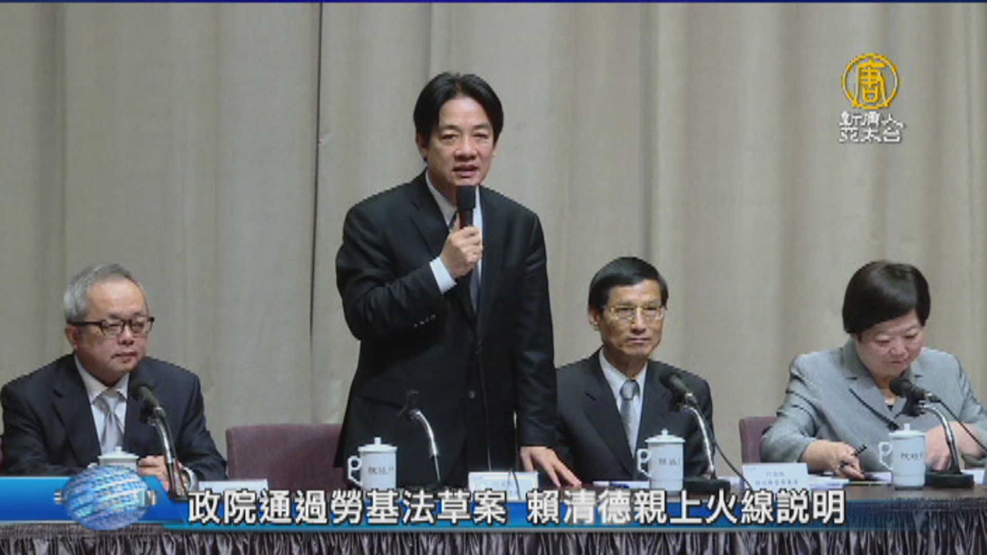 【新唐人亞太台 2017 年 11 月 09 日訊】歡迎回來。再來把焦點轉回台灣,行政院今天(9日)通過勞基法修法草案,院長賴清德親自召開記者會說明。賴清德表示,一例一休修法之後,維持四個不變、四個彈性,確保勞工與企業權益。