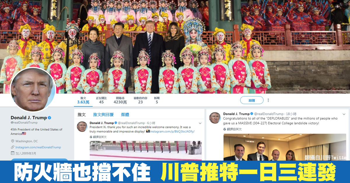 【新唐人亞太台 2017 年 11 月 09 日訊】防火牆也擋不住川普推特一日三連發