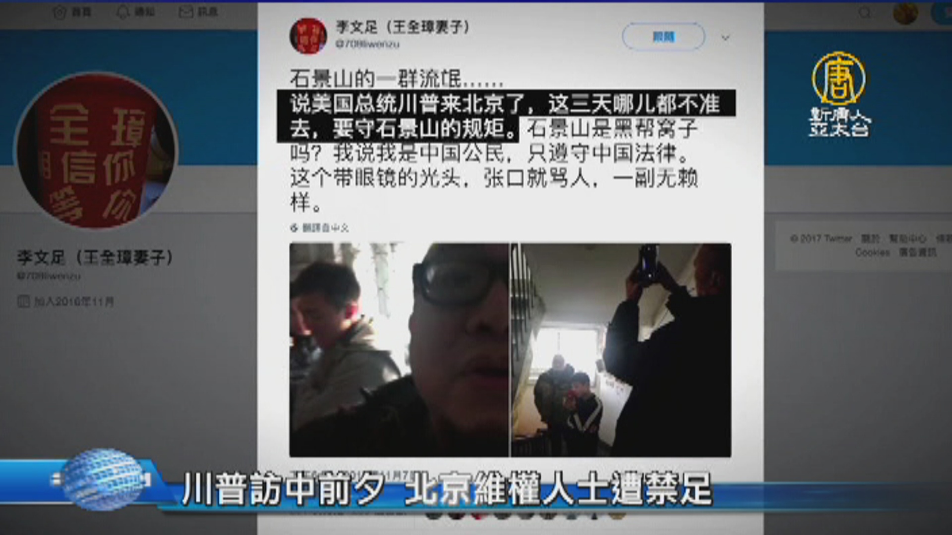 【新唐人亞太台 2017 年 11 月 09 日訊】歡迎回來。美國總統川普,昨天下午訪問中國,不過,在川普抵達北京的前一天,曾代理敏感案件的北京道衡律師事務所,被安排片警和協警上崗。709案王全璋律師的妻子李文足也被禁足在家中,三天不准外出。