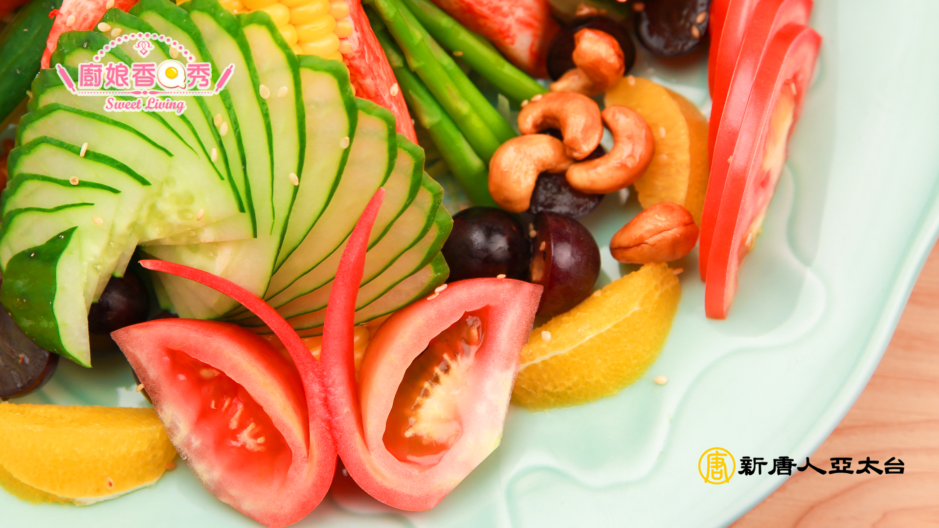 食材:美生菜絲、洋蔥絲、玉米、小黃瓜、蘆筍、熟蟳棒肉、蕃茄、柳橙、葡萄、柴魚片、白芝麻、柳橙汁、檸檬汁少許。