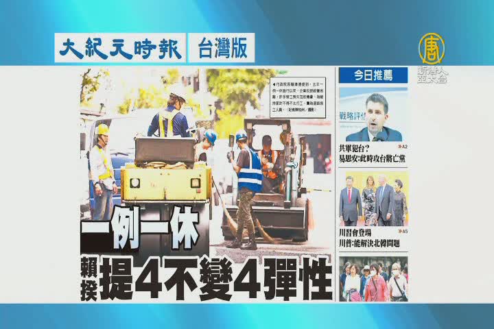 【新唐人亞太台 2017 年 11 月 10 日訊】繼續看到大紀元時報台灣版報導:一例一休,賴揆提4不變4彈性。