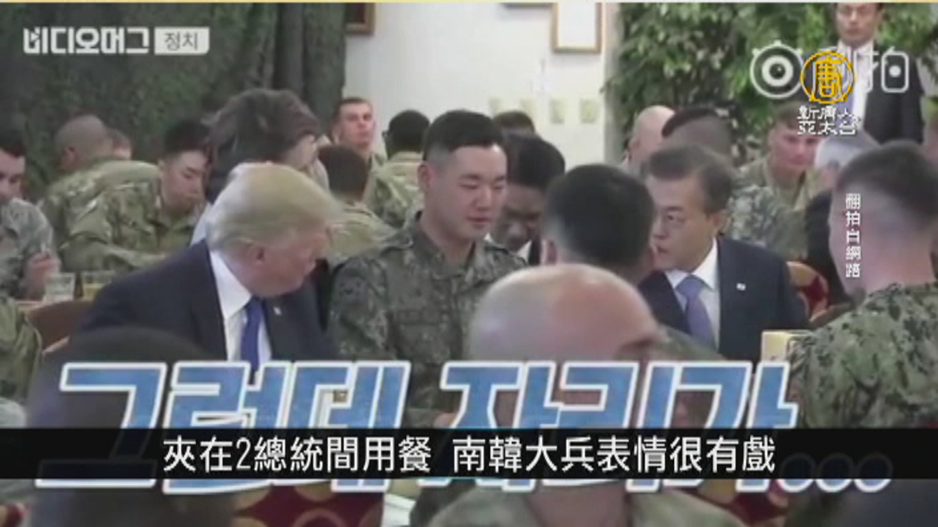 美國總統川普造訪亞洲,8日與南韓總統文在寅抵達南韓京畿道平澤駐美軍基地,與韓、美軍人一同共進午餐,不過兩位國家領袖中間夾了一個南韓大兵,只見他面露尷尬,一副坐立難安的模樣。