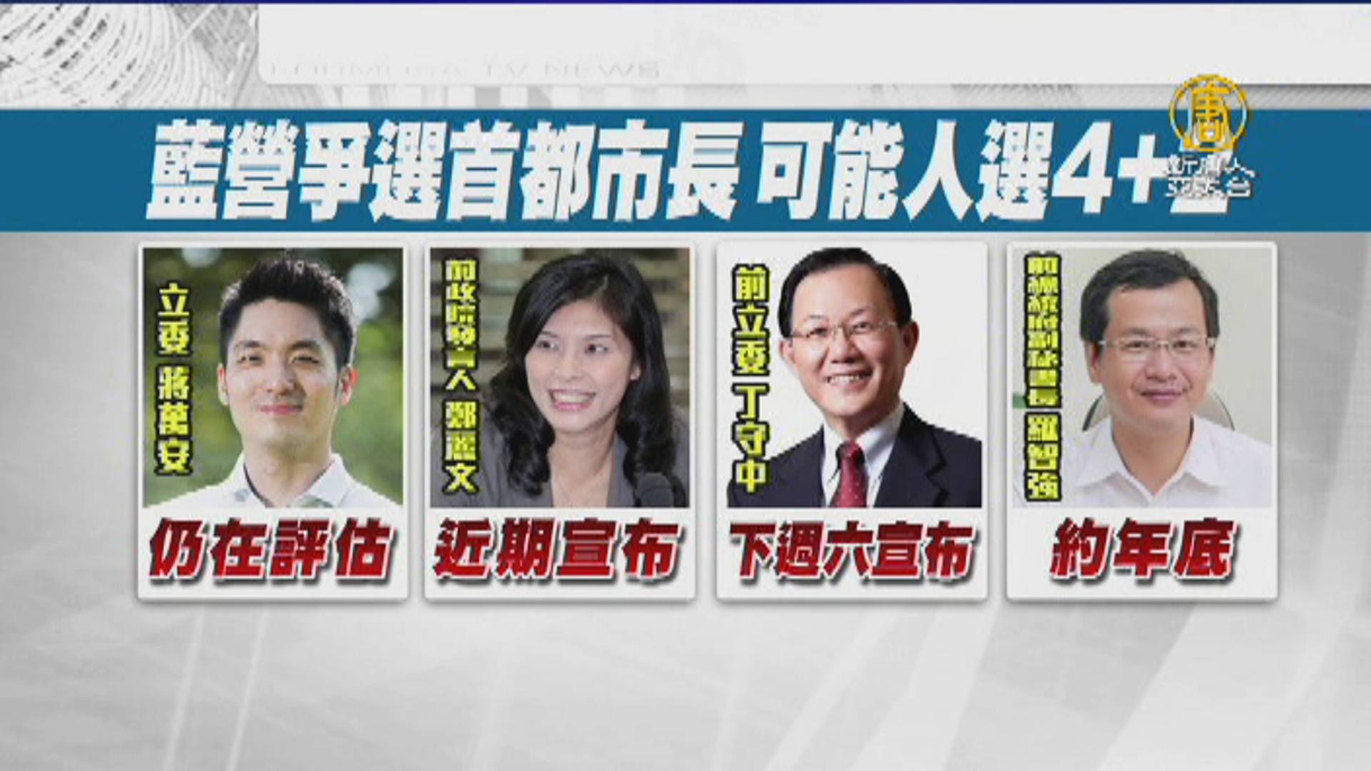 蔣萬安還在評估,但黨內其他人參選時間表已經明朗,前政院發言人鄭麗文,拜會黨主席吳敦義後,近期就會宣布。前立委丁守中正研擬市政白皮書,預計下周六(11月18日)宣布參選。前總統府副秘書長羅智強鎖定臉書拋議題空軍策略,如果年底粉絲人數突破百萬就要宣佈參選。另外國民黨台北市黨部透露,還有一位醫界跟學界人士也有意參選,黨內呈現4+2爭選狀態。