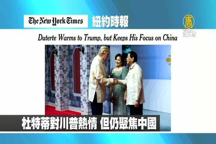 【新唐人亞太台 2017 年 11 月 13 日訊】首先來看到美國紐約時報報導:菲律賓總統杜特蒂對美國總統川普熱情,但仍聚焦中國。