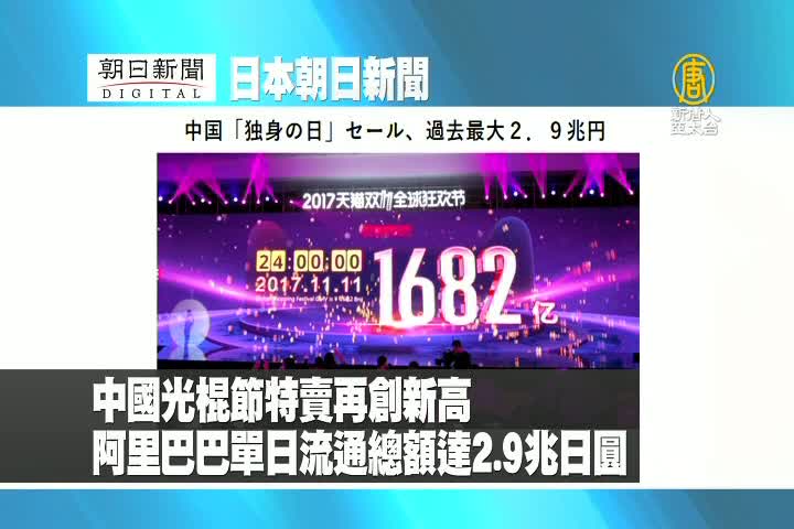 【新唐人亞太台 2017 年 11 月 13 日訊】來看到日本朝日新聞報導:中國光棍節特賣再創新高,阿里巴巴單日流通總額達2.9兆日圓。