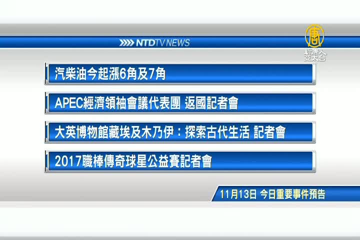 【新唐人亞太台 2017 年 11 月 13 日訊】接著看到,今天, 11月13日,星期一 ,有哪些重要活動。首先是,民生消息,油價連四漲,汽柴油今起漲6角及7角。再來是,APEC經濟領袖會議代表團 返國記者會。另外,大英博物館的館藏在故宮,今天有一場開幕記者會。最後是體育消息,2017職棒傳奇球星公益賽記者會。