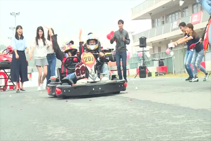 左邊三台,右邊三台,伴郎伴娘依序進入賽車跑道,接著重頭戲才要開始。新人開著卡丁車隆重登場,原來這不是賽車比賽,而是一場婚禮。