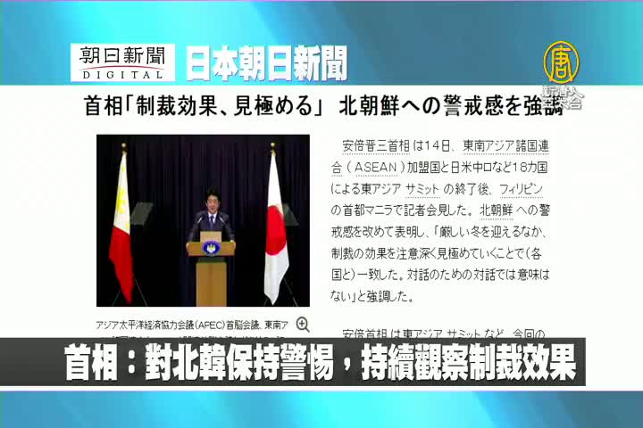 【新唐人亞太台 2017 年 11 月 15 日訊】來看到日本朝日新聞報導:日本首相安倍晉三強調,要對北韓保持警惕,並持續觀察制裁效果。