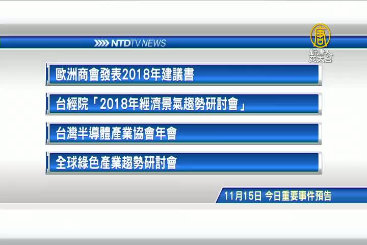 【新唐人亞太台 2017 年 11 月 15 日訊】接著看到,今天, 11月15日,星期三 ,有哪些重要活動。首先是。歐洲商會發表2018年建議書。接著是,台經院舉辦「2018年經濟景氣趨勢研討會」。再來是,台灣半導體產業協會年會,今天在新竹舉辦。最後是,全球綠色產業趨勢研討會,今天開講。