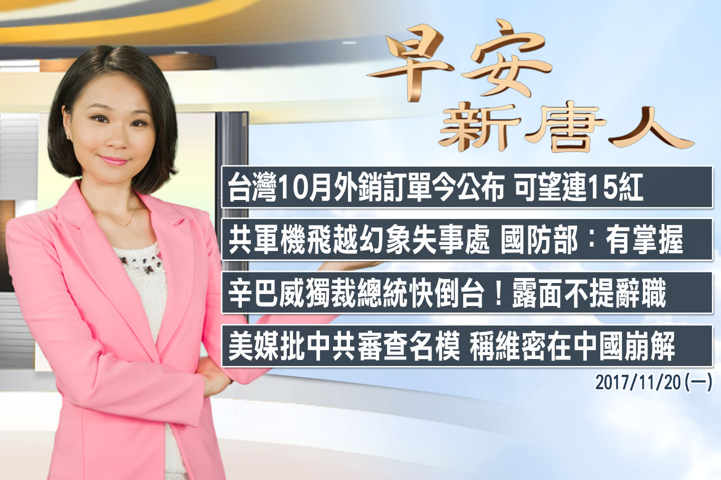 2017-11-20 13:49:26十一月20日,星期一,新唐人午間新聞,30分鐘,帶您看見全世界。