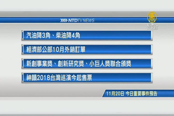 【新唐人亞太台 2017 年 11 月 20 日訊】接著看到,今天, 11月20日,星期一 ,有哪些重要活動。首先是,民生消息,油價終止連四漲,今天凌晨開始,汽油降3角、柴油降4角。再來是,經濟部公部10月外銷訂單,有望連15紅。另外,今天有一場新創事業獎、創新研究獎、小巨人獎聯合頒獎。最後是,神韻2018台灣巡演,今天起,開始售票。