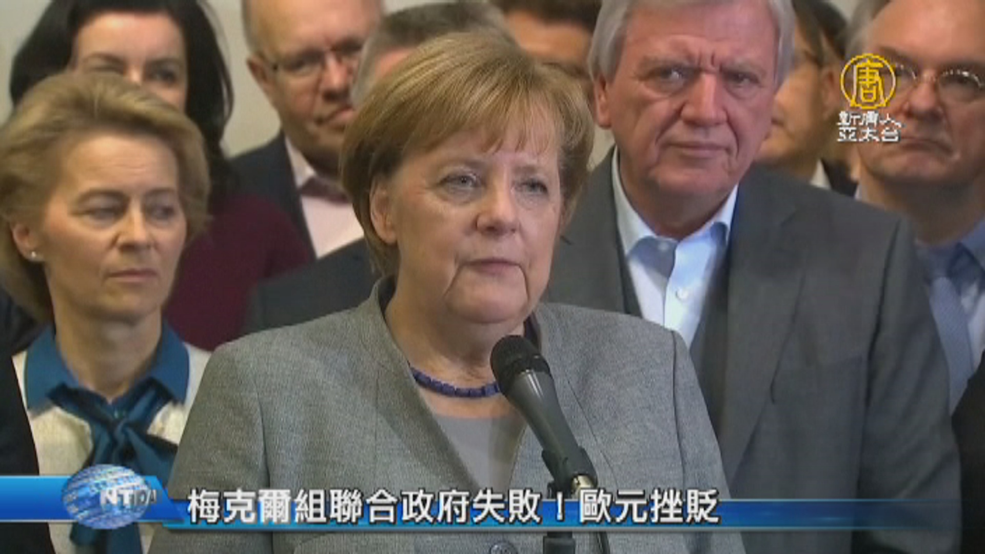 【新唐人亞太台 2017 年 11 月 20 日訊】國際焦點再來看到,德國總理梅克爾,選舉四連霸,不過現在卻面對籌組聯合政府失敗,最壞的情況,就是明年重新大選,今天歐元兌美元聞訊挫貶,貶幅來到3週最大。 好,梅克爾原本要在台灣時間今天凌晨1點前協商籌組聯合政府,不過,因為卡在移民政策和環保等棘手問題,自由民主黨已經宣布退出協商,這次破局,表示梅克爾必須尋求和綠黨組成少數政府,甚至可能重新舉行大選。