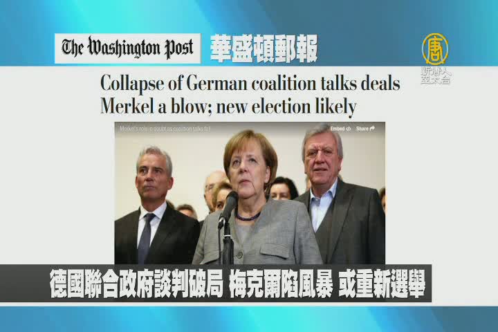 【新唐人亞太台 2017 年 11 月 21 日訊】首先來看到美國華盛頓郵報報導:德國組聯合政府談判破局,德國總理梅克爾陷入風暴,或重新選舉。