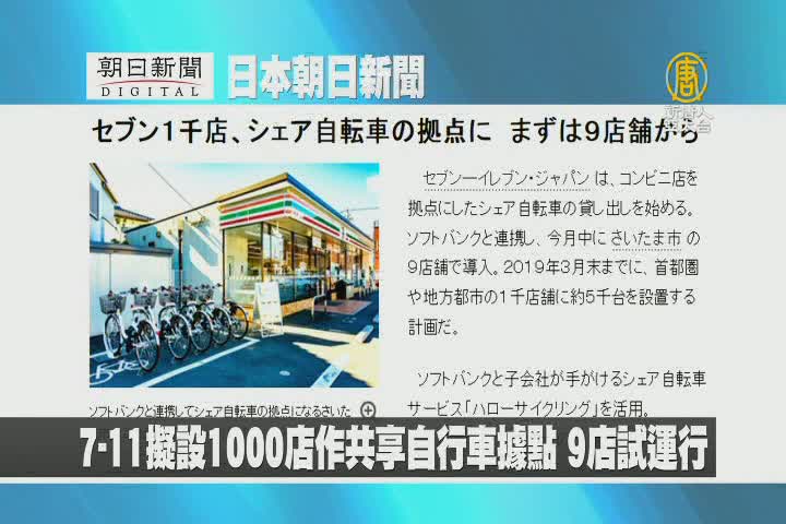 【新唐人亞太台 2017 年 11 月 21 日訊】來看到日本朝日新聞報導:日本7-11預計將設置1千間店舖,當作共享自行車的據點,先從9家店開始嘗試運行。