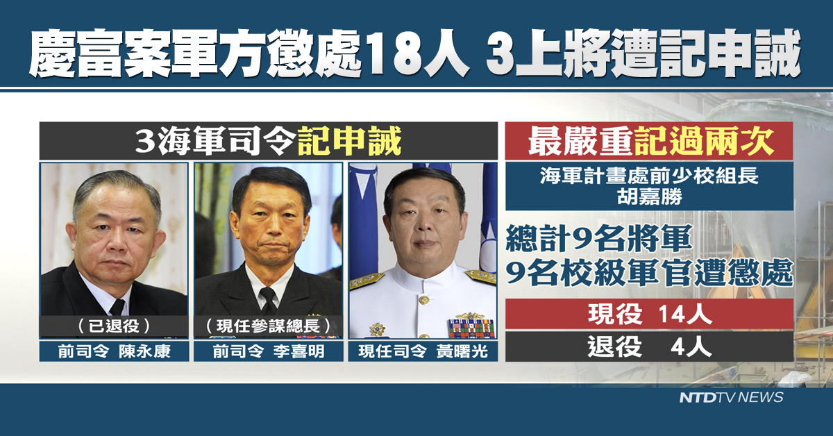 【新唐人亞太台 2017 年 11 月 22 日訊】火線新聞,帶您關注。國防部今天(22日)公布慶富獵雷艦案懲處名單,包括18名現役與退役人員,分別遭到記過與申誡。海軍前後三任退役與現役司令,都遭到申誡兩次的處分。