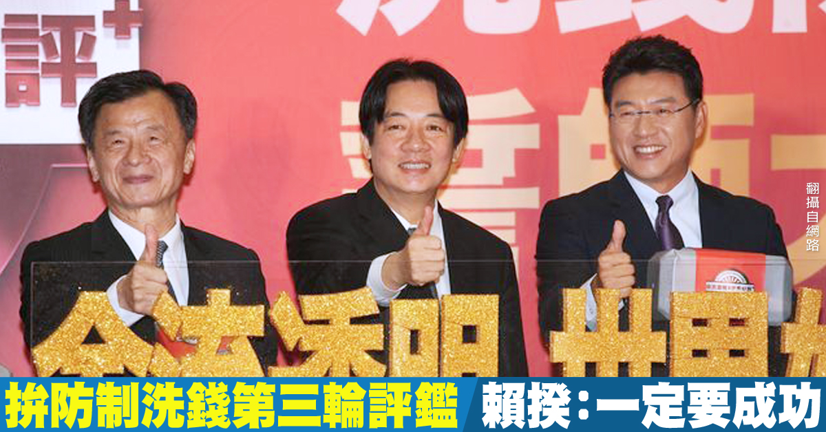 大陣仗召開誓師大會,行政院長賴清德,宣誓要通過明年「亞太防制洗錢組織(APG)」的第三輪評鑑,因為台灣雖然是APG的創始會員,卻在2011年被列為過渡追蹤名單,今年七月,因林全推動修法等,才好不容易脫離,加上明年中國可能也要接受評鑑,台灣更得面對重重考驗。
