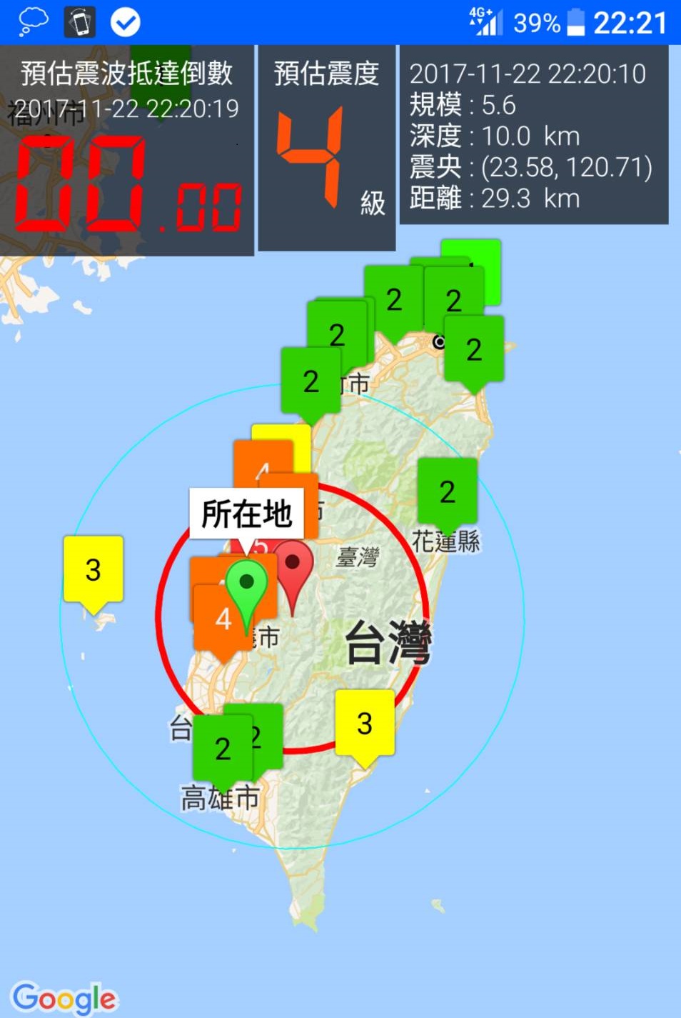 【新唐人亞太台 2017 年 11 月 22 日訊】晚間22點20分10秒發生規模5.5有感地震,震央(北緯23.59°東經120.73°)在嘉義阿里山鄉,震源深度18.5公里,位於嘉義縣政府東偏北方46.5公里。包括台北市等全台多縣市有感。嘉義、雲林5級,彰化、南投、台中、台南4級,高雄、花蓮、澎湖3級,台東、苗栗、屏東、宜蘭、新竹2級,桃園、台北1級。