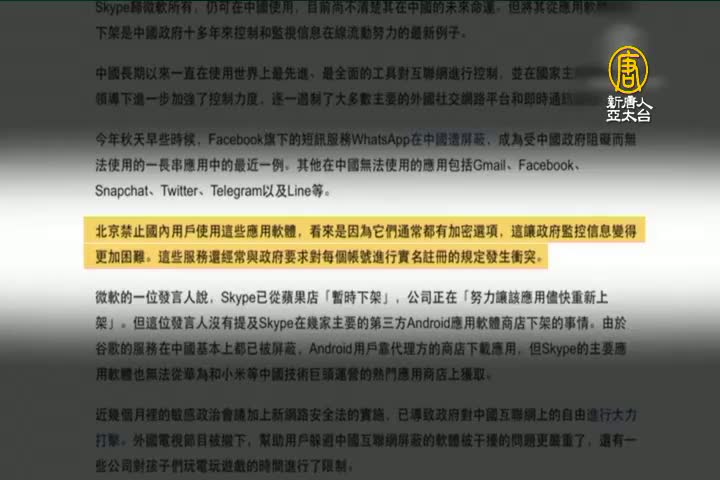 【新唐人亞太台 2017 年 11 月 23 日訊】網路電話通訊軟體「Skype」遭多家中國區應用商店下架已快一個月了,蘋果公司回應,這是來自中共公安部的通知。大陸網友認為,中共封殺大陸言論自由,Skype加密難監控,所以遭到封殺。
