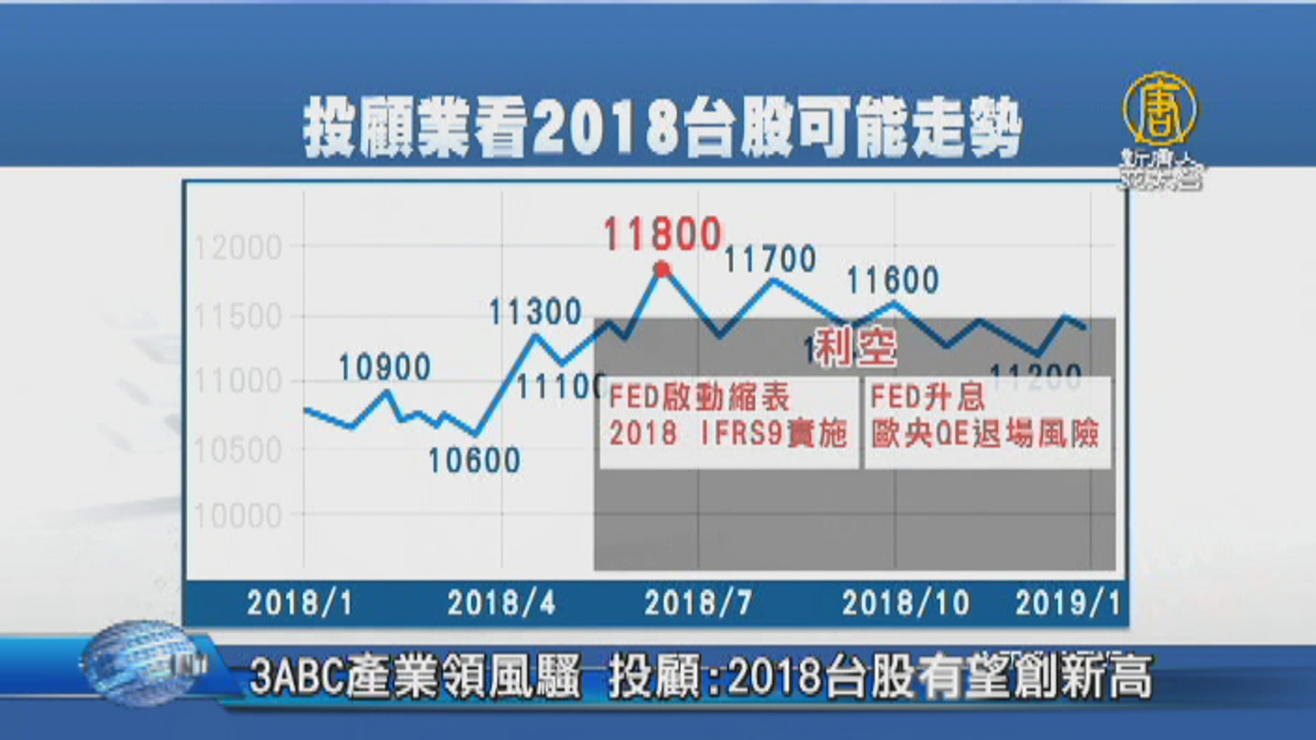 投顧業舉辦展望會,看好2018年上半,金融市場持續活絡,預估台股在美國製造業回流、中國一帶一路帶動下,2018年第二季可望攀升至11800點關卡,第三季則開始震盪走低,不利因素有兩岸關係惡化、FED啟動縮表、QE退場風險,以及歐洲央行升息。