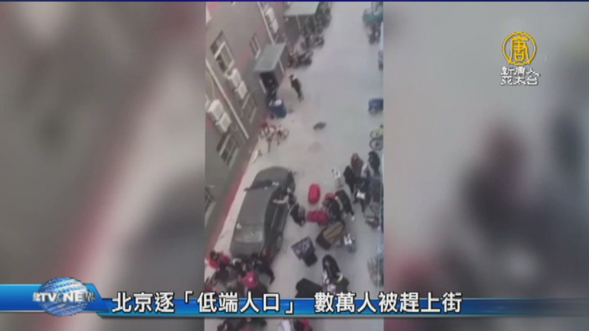 而另一個視頻顯示,數以萬計被政府視為低端人口的民眾帶著行李,離開自己居住的租屋,走向天寒地凍的大街。