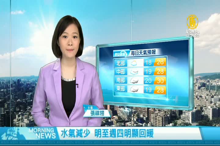 【新唐人亞太台 2017 年 11 月 27 日訊】歡迎您收看11月27日的早安新唐人,先來帶您關心今天的天氣情況。又是一個星期的開始了,今天開始,水氣減少,從星期二到星期四,會明顯回暖,中部以北白天高溫會達28、29度,南部高溫則上看30度、31度。提醒觀眾朋友,夏季的衣服還是不要太快收。帶您一起來看到國際媒體重要訊息。