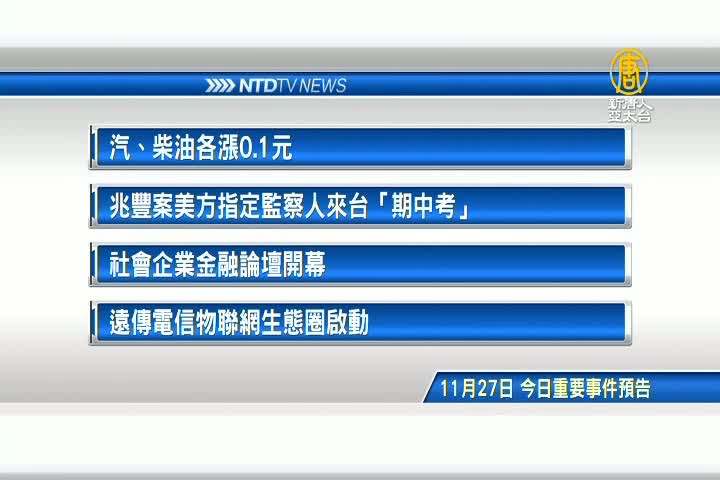 【新唐人亞太台 2017 年 11 月 27 日訊】接著看到,今天, 11月27日,星期 ,有哪些重要活動。首先看到民生消息,汽、柴油今天各漲0.1元。接著看到,兆豐涉嫌洗錢案,美方指定監察人來台「期中考」。再來是,社會企業金融論壇開幕。財經消息,遠傳電信物聯網生態圈啟動。
