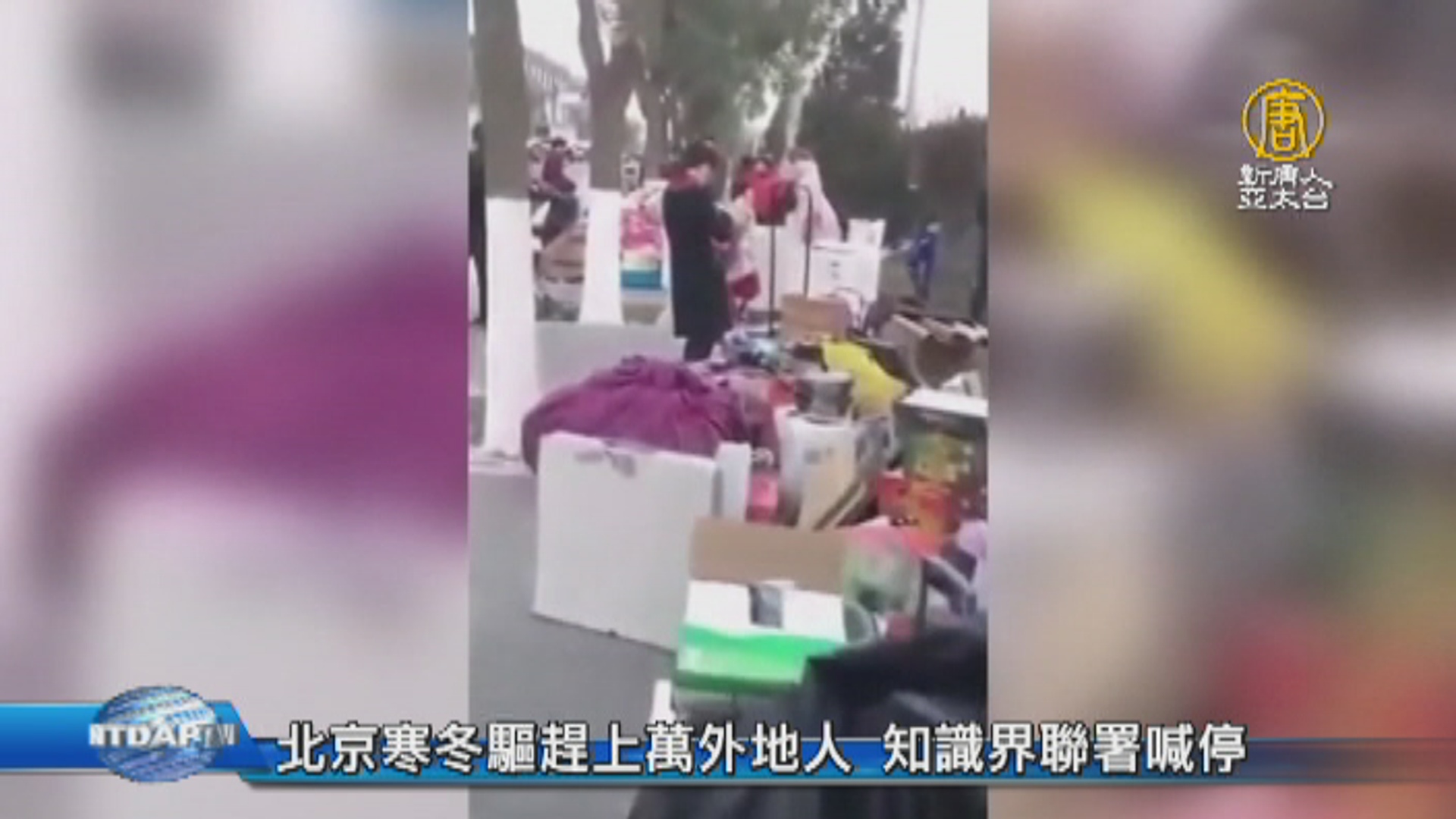 【新唐人亞太台 2017 年 11 月 27 日訊】北京大興區發生火災後,北京市在全市展開為期40天的地毯式清理外地人行動,零下幾度的寒冬天氣中,上萬人在一天內就無家可歸,很多中國自由派人士對此聯名發表公開信,要求停止驅趕行為。