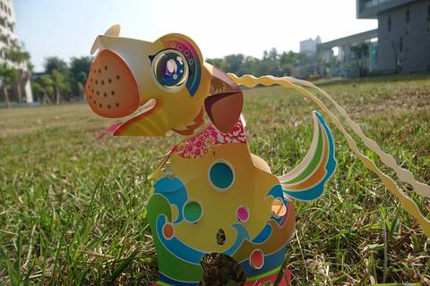 「旺來狗」鳳梨型的提帶,提供小提燈彈力,讓提燈更具活力(高雄市府提供)