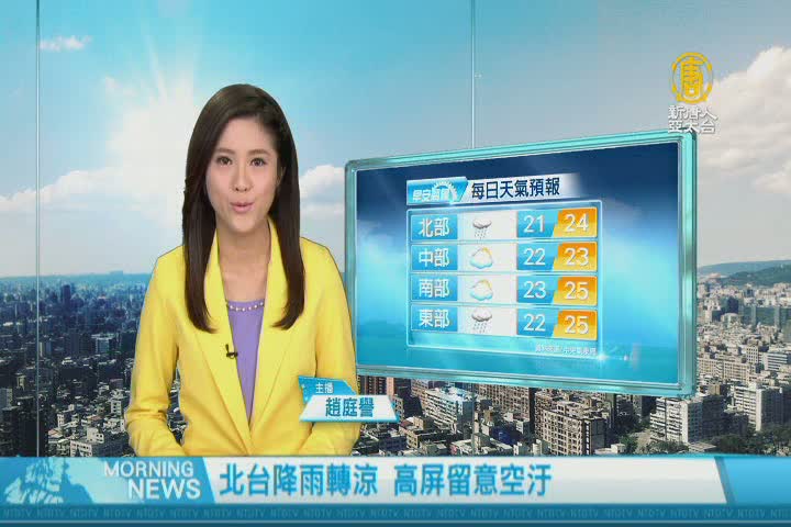【新唐人亞太台 2017 年 11 月 30 日訊】歡迎您收看11月30日的早安新唐人,我是趙庭譽,先來帶您關心今天的天氣情況。昨天,全台最高溫是台北市,來到30.4℃,但今天開始,北台灣會降溫轉為有雨提醒觀眾朋友出門多加件衣物,另外,昨天全台空汙是入秋以來最糟,環保署提醒,高屏地區紅害的汙染指標,可能會維持三天,也請敏感族群的觀眾朋友,避免戶外活動。帶您一起來看到國際媒體重要訊息。