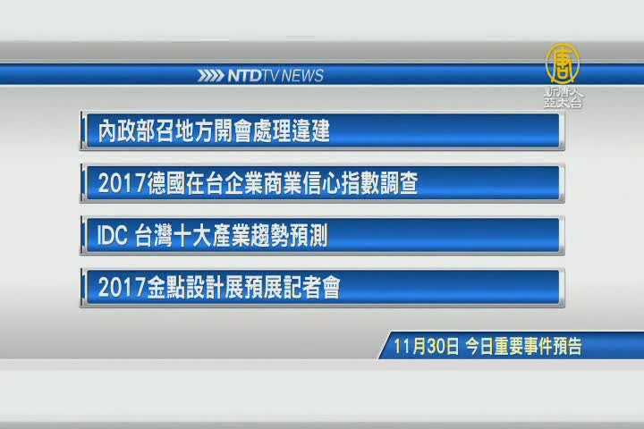 【新唐人亞太台 2017 年 11 月 30 日訊】接著看到,今天, 11月30日,星期四 ,有哪些重要活動。首先是,內政部今天召集地方開會討論處理違建。接著看到,2017德國在台企業商業信心指數調查發布。再來是,IDC 台灣十大產業趨勢預測。最後是,2017金點設計展預展記者會。
