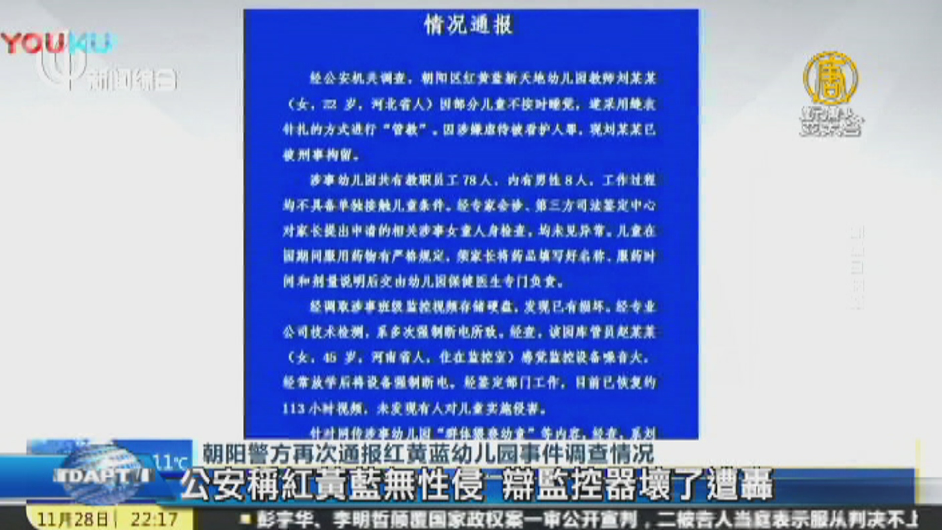 【新唐人亞太台 2017 年 11 月 30 日訊】關心中國紅黃藍幼兒園侵害兒童事件,北京公安發出通報稱,沒發現有人對兒童實施侵害,還說女童家長承認造謠,幼稚園監控影像的硬碟損壞,消息再次輿論譁然,有網友怒斥,這根本是藐視民眾的智商和容忍度。