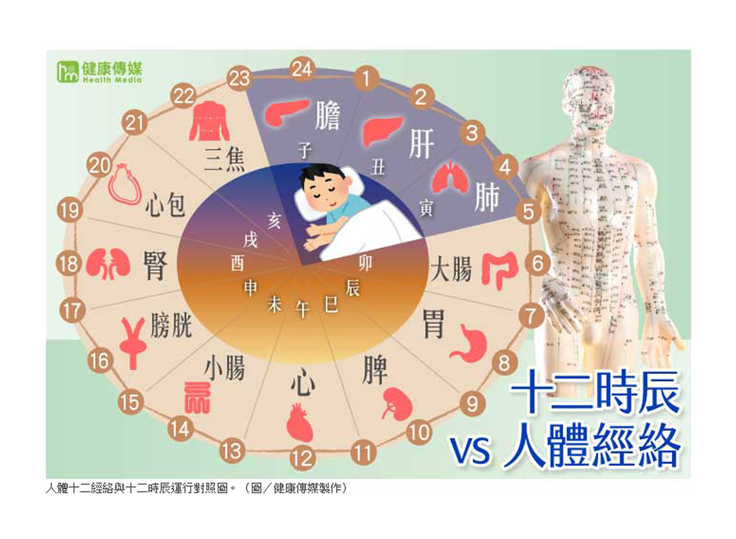中醫問診時常會問患者「睡眠好不好?」鄭愛蓮說明,《黃帝內經》記載人體十二經絡與十二時辰的運行相互對應,例如深夜11點至凌晨3點是膽肝運行期,若此時未入睡,會導致身體排毒、修復能力下降,皮膚疾患常易於此期間犯癢,難以成眠。