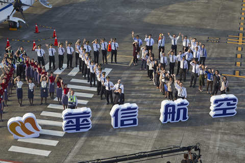 華信航空首架ATR抵台 松山機場百人排字(華信提供)