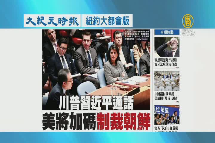 【新唐人亞太台 2017 年 12 月 01 日訊】接著看到大紀元時報紐約大都會版報導:川普、習近平通話,美國將加碼制裁朝鮮。