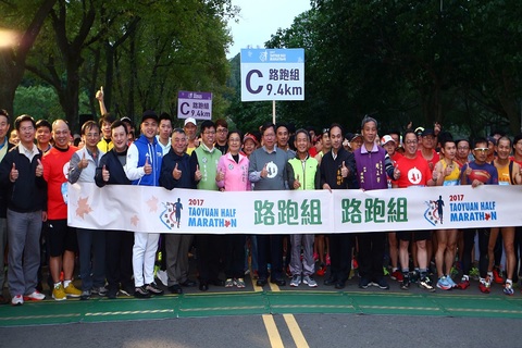 桃園市長鄭文燦率領千名桃園『在地家鄉成員』為2017桃園半程馬拉松 石門水庫楓半馬-前進國際認(桃園市府提供)