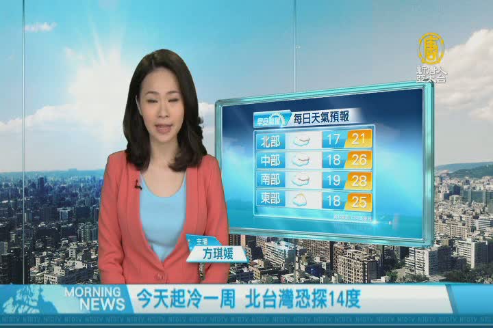 【新唐人亞太台 2017 年 12 月 04 日訊】歡迎您收看12月4日的早安新唐人,我是方琪媛,先來帶您關心今天的天氣情況。又是一個星期的開始了,昨天北台灣氣溫小幅回升,不過,今天開始,又要冷一個星期,因為冷空氣南下,今天北台灣低溫在17到20度,中南部則是在18到25度,而星期二到星期三清晨最冷,北台灣沿海最低溫,將降到14度左右,提醒觀眾朋友留意。帶您一起來看到國際媒體重要訊息。
