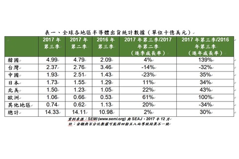SEMI台灣區總裁曹世綸表示,2017年第三季的全球設備出貨金額達143億美元,超越上一季創下的季度高點,再度刷新單季出貨紀錄。今年第三季全球半導體出貨金額較第二季成長2%,與去年同期相比大幅成長30%。最新一季各地區的成長率表現不一,歐洲地區成長幅度最為強勁。就整年度出貨金額而言,韓國、台灣與中國仍穩居全球前三大半導體設備市場。以上數據是由 SEMI 與 日本半導體設備產業協會(Semiconductor Equipment Association of Japan,SEAJ )共同蒐集全球共計95家以上的半導體設備公司每月資料之統計結果。