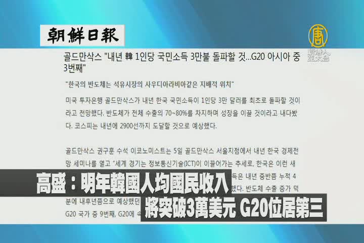 【新唐人亞太台 2017 年 12 月 06 日訊】來看到韓國朝鮮日報報導:美投行高盛稱,「明年韓國人均國民收入將突破3萬美元,在G20國家中位居第三」。