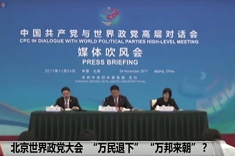 【新唐人亞太台 2017 年 12 月 06 日訊】12月3日,中共牽頭在北京舉行的世界政黨大會已經落幕,新華社為此次大會專題解讀《中國共產黨的「執政密碼」》。多位學者人士認為中共的執政密碼就是謊言、暴力和錢袋子。11月30日至12月3日,來自120多個國家200多個政黨的領導人在北京參加世界政黨大會,主題是「構建人類命運共同體、共同建設美好世界:政黨的責任」。