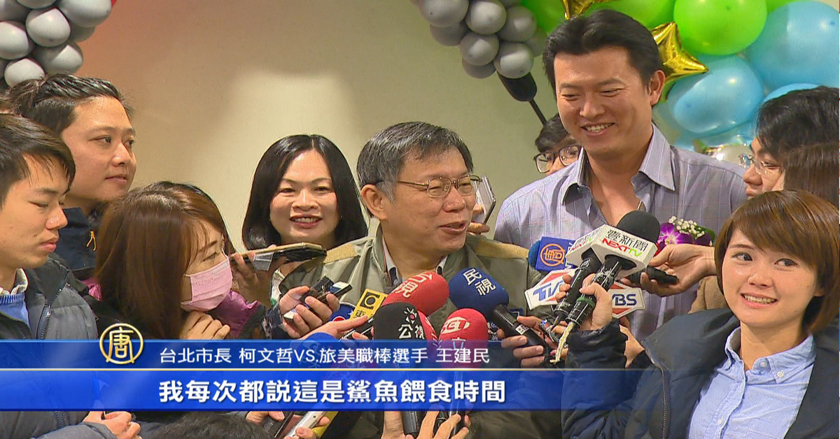 台北市長 柯文哲VS.旅美職棒選手 王建民:「你要習慣、你要習慣這種鯊魚陣,你還沒習慣嗎?不喜歡,我每次都說這是鯊魚餵食時間,(市長第一次跟王建民碰到嗎)?第一次看到本人,(感覺怎麼樣)?好高喔!」