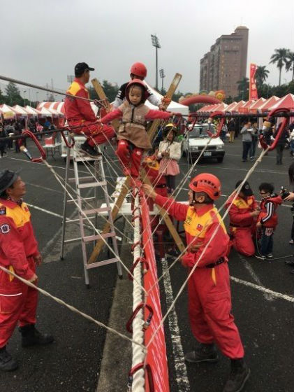 嘉市義勇特搜隊在會場搭設闖關活動「繩索突襲吊橋」,吸引許多小朋友挑戰。(嘉市義勇特搜隊提供)