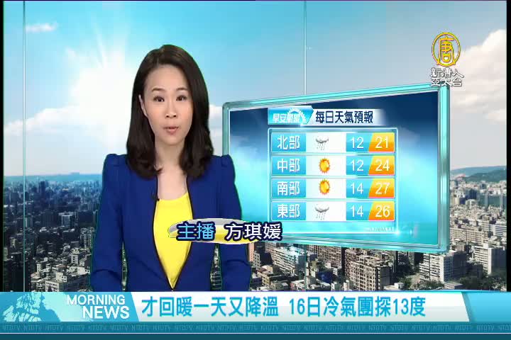 【新唐人亞太台 2017 年 12 月 11 日訊】歡迎您收看12月11日的早安新唐人,我是方琪媛,先來帶您關心今天的天氣情況。又是一個星期的開始了,昨天全台回暖,久違地陽光露臉,不過,只維持一天,今天東北季風報到,北部高溫會再下降2、3度,另外,星期六可能會有強烈大陸冷氣團報到,氣象局初估,星期天晚上開始,北台灣可能下探13、14度,提醒觀眾朋友留意保暖。帶您一起來看到國際媒體重要訊息。