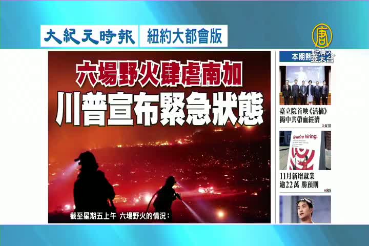 【新唐人亞太台 2017 年 12 月 11 日訊】接著看到大紀元時報紐約大都會版報導:六場野火肆虐南加州,川普宣布緊急狀態。