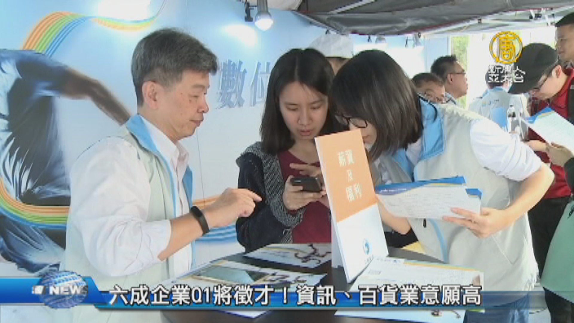 【新唐人亞太台 2017 年 12 月 11 日訊】人力銀行資料顯示,明年第一季,六成企業有徵才意願,相較於去年微幅下滑2%,人力銀行指出,資訊科技業以及百貨販售,明年第一季徵才意願高,但營建不動產業,徵才意願最低。