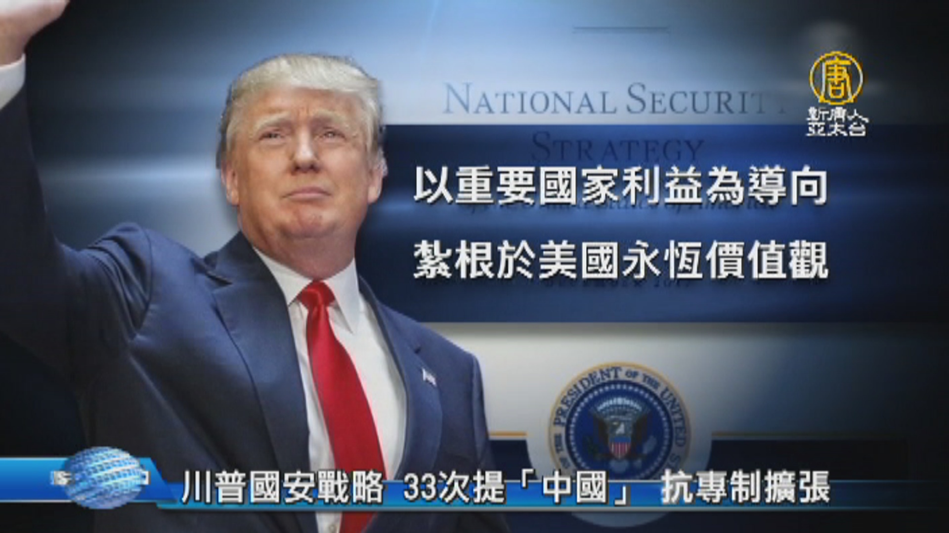 【新唐人亞太台 2017 年 12 月 20 日訊】週一,川普政府公布了第一次「國家安全戰略」報告,闡述了川普的國際戰略政策。報告將中共與俄羅斯,列為侵蝕美國繁榮安全的主要威脅,未來美國要在經濟、區域影響力等多個方面,全面抵禦中共與俄羅斯,並持續擴大美國的國際影響力。