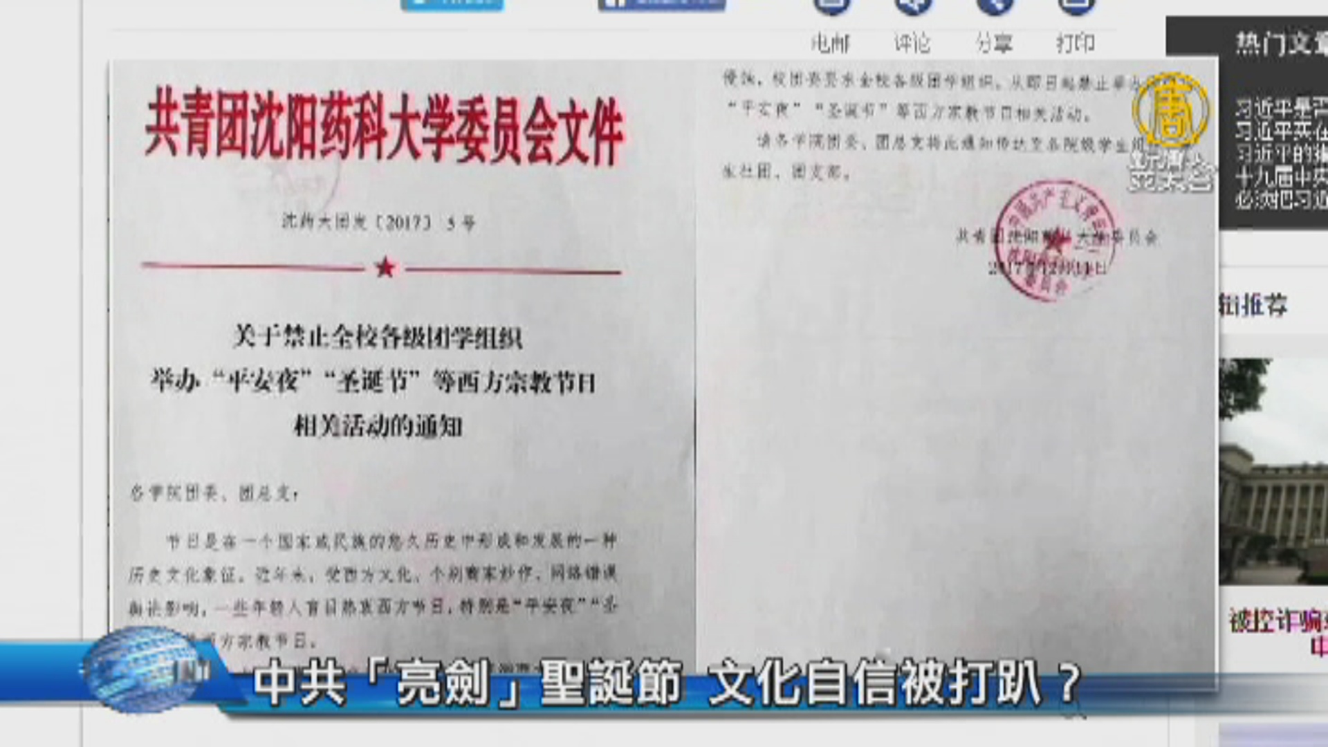 共青團瀋陽藥科大學11號也發出通知,禁止該校舉辦與平安夜、聖誕節等西方宗教節日相關的活動,說是「為引導廣大團員青年樹立文化自信,自覺抵禦西方宗教文化侵蝕。」
