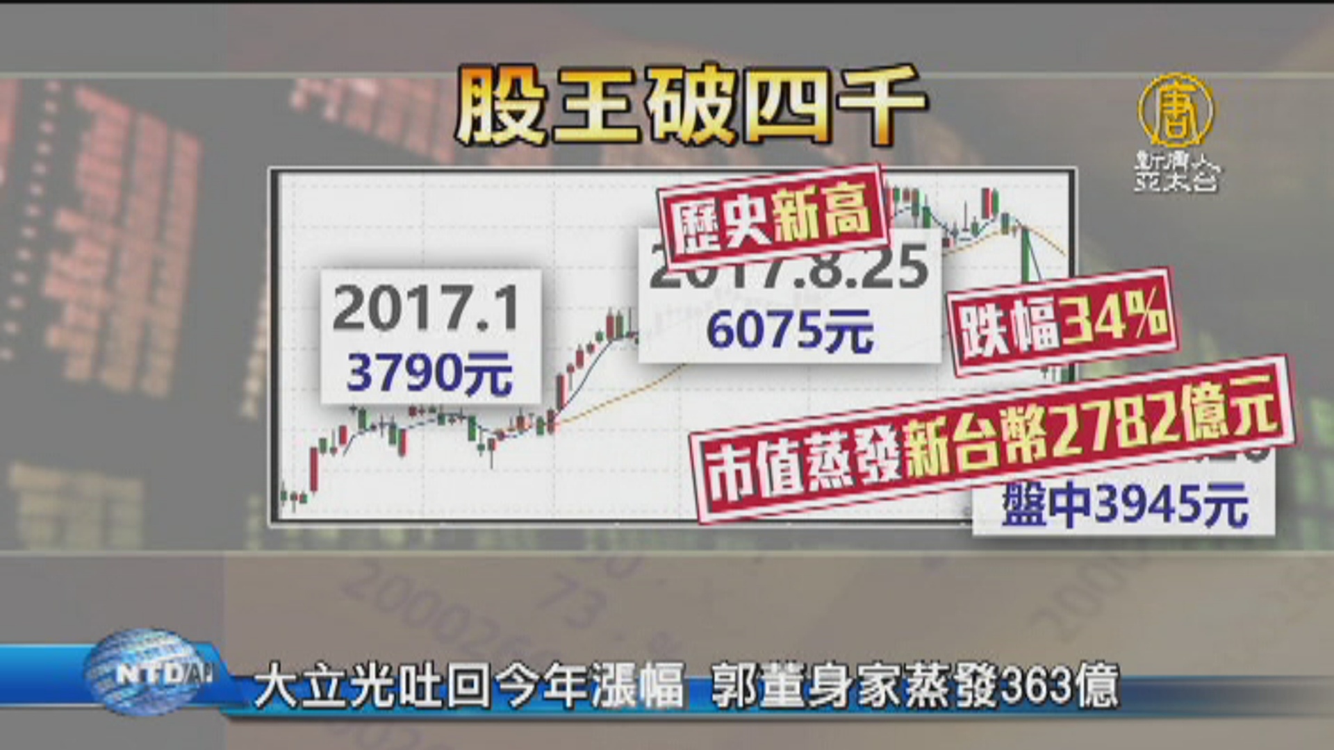 【新唐人亞太台 2017 年 12 月 26 日訊】再來關心台股,股王大立光面臨4000元保衛戰,今天(12月26日)不敵賣壓,開盤第一分鐘就摜破4000元,一度來到3945元,受到蘋果新機銷售不如預期的影響,大立光股價從8月歷史高點,至今跌幅高達30%,執行長林恩平家族資產縮水326億元,而這一波回檔,連鴻海董事長郭台銘,短短兩個月資產都縮水363億元!