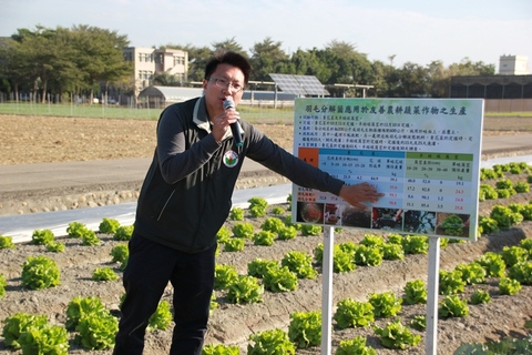 曾宥綋博士介紹羽毛分解菌應用於青花菜及萵苣生產技術 (臺中農改場提供)