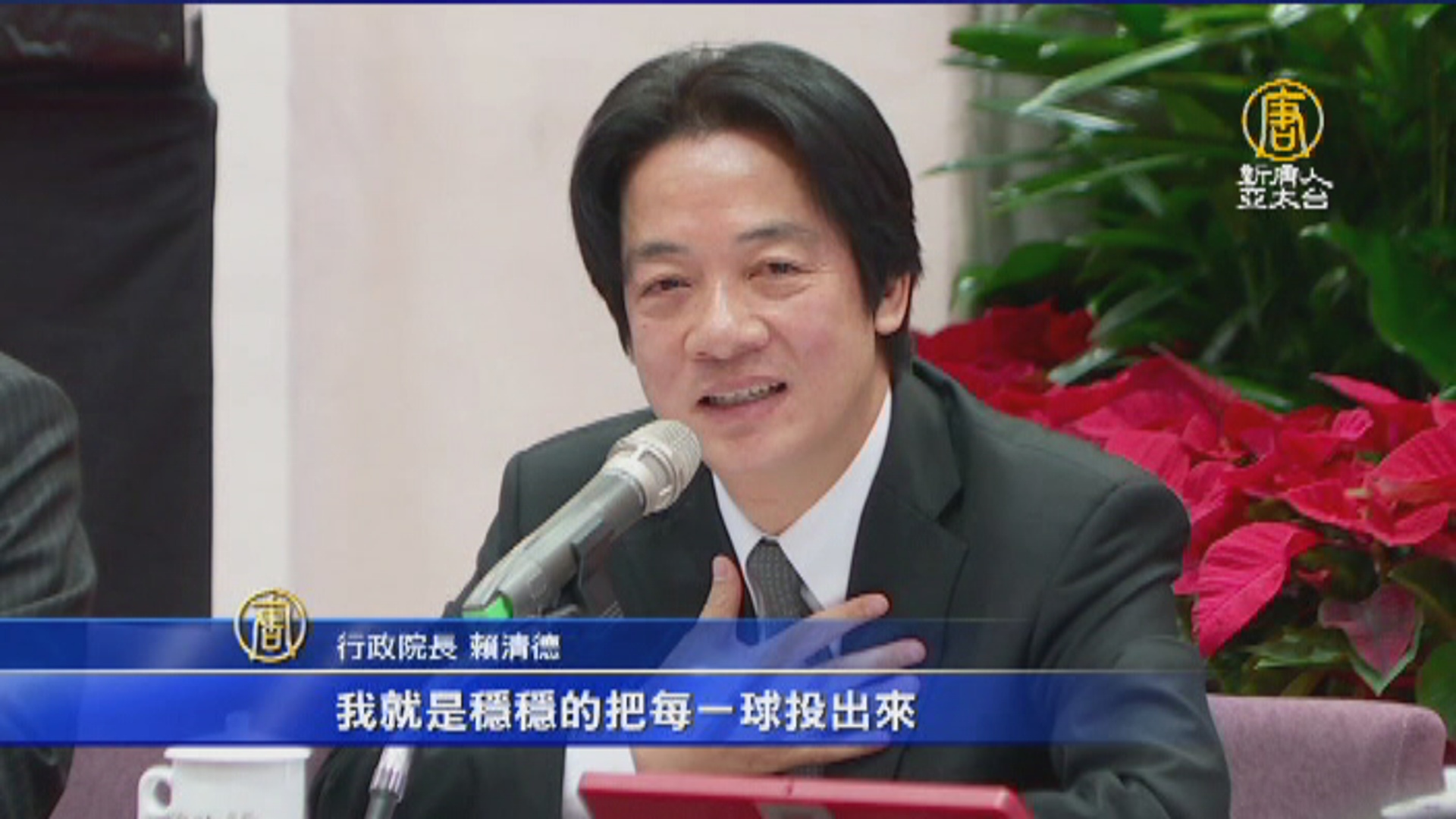 【新唐人亞太台 2017 年 12 月 27 日訊】火線新聞,馬上來看到,行政院長賴清德,今天(27日)舉辦年終記者會,列舉三個月以來施政成果,與未來政策走向。談到上任以來的心情,賴清德自比棒球場上的中繼投手,穩穩的投出每一球,也說到目前為止,政務推動都還算順利。