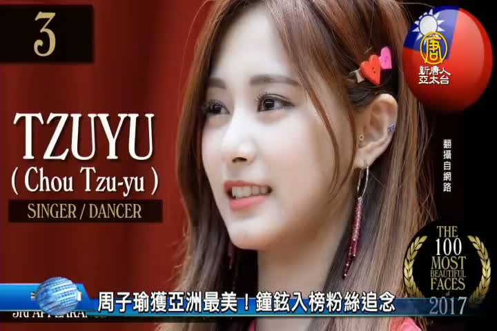 【新唐人亞太台 2017 年 12 月 28 日訊】再來看到,年僅18歲的韓團台裔明星周子瑜,被電影網站「TC Candler」,選入全球最美臉孔第三名。在亞洲女藝人中,排名第一,在官方影片中,放入周子瑜甜美微笑,與中華民國國旗。周子瑜身高170公分,出道兩年多,她所屬的女團TWICE,也即將登上日本紅白歌唱大賽。另外,在男性藝人部分,日前逝世的韓星鐘鉉,也入選百大帥哥,影片中以黑白處理,還特別放上 鐘鉉閉眼微笑的照片,加上哀悼文字,留給粉絲無限惋惜、追念。